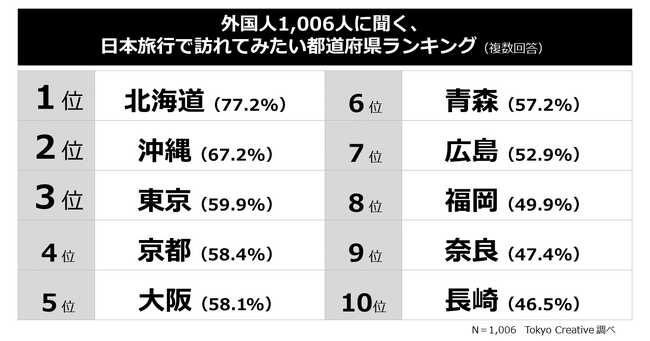 日本人と外国人の“両目線”を生かした動画で自治体や企業の外国人へのアプローチを支援するTokyo Creative株式会社(所在地:東京都墨田区、代表取締役:中川智博・小野沢隆、https://www.tokyocreative.jp/ja/ )は、日本への外国人観光客増加の報道を受け、日本以外の国籍をもつ外国人1,006人(欧米豪86%、アジアそのほか14%)に「日本旅行で訪れてみたい都道府県とその際に活用するSNS」に関する英語での調査を実施しました。