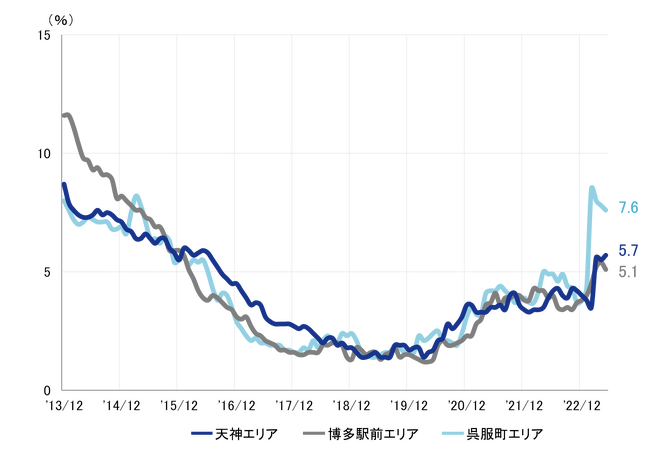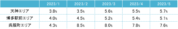 全規模ビル 主要エリア 空室率:「博多駅前」7ヵ月ぶりに低下し、4%台が目前に