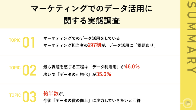 一方で、約7割がマーケティングでのデータ活用に対し、課題を実感しており、具体的には「データ分析が難しい」などの声が挙がっています。特にビジネス課題を解決するためにデータを用いてアプローチする「データ利活用」の工程に最も課題を感じており、今後は、分析目的に合ったデータ取得などといったデータの質の向上の取り組みに注力していきたいと回答したマーケティング担当者が半数近くいました。