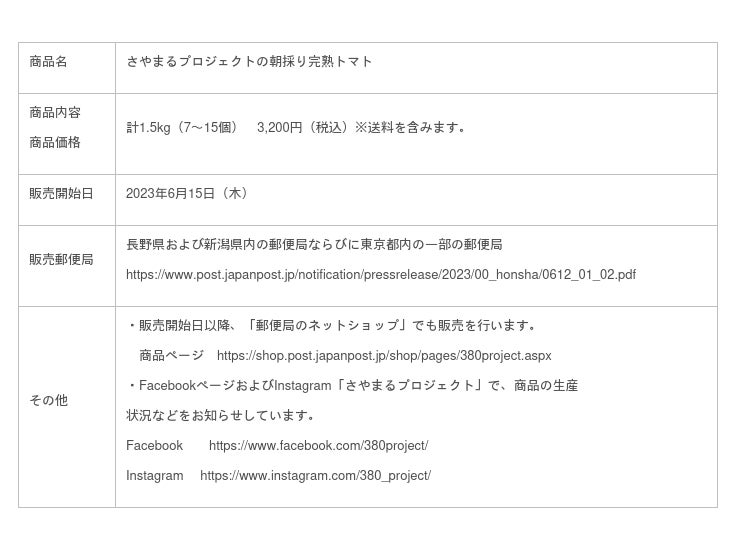 日本郵便株式会社(東京都千代田区、代表取締役社長 衣川 和秀)は、生産からお届けまでを手掛けるオリジナル商品「さやまるプロジェクトの朝採り完熟トマト」を、2023年6月15日(木)から郵便局のネットショップで販売開始します。また、同日から長野県および新潟県内の郵便局ならびに東京都内の一部の郵便局(下表参照)に設置するふるさと小包チラシでも申し込みを受け付けます。