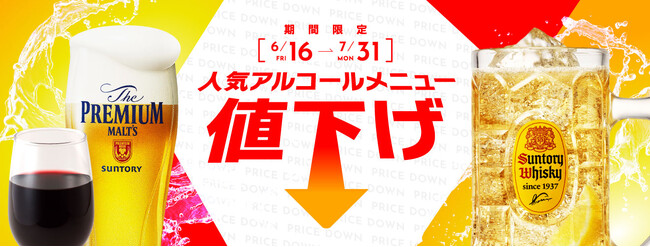 今回値下げ対象となるのは、全10種のアルコールメニューのうちの6種で、定番の「サントリー・ザ・プレミアム・モルツ」は100円引き、「角ハイボール」は130円引きなど、7月31日(月)までの