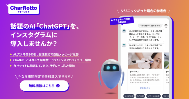 簡単にカスタマイズ可能なAIチャットボット「CharRotto(チャーロット)」がInstagram・LINEの全自動コミュニケーションを実現するために、20社限定でβ版トライアル利用企業を募集します