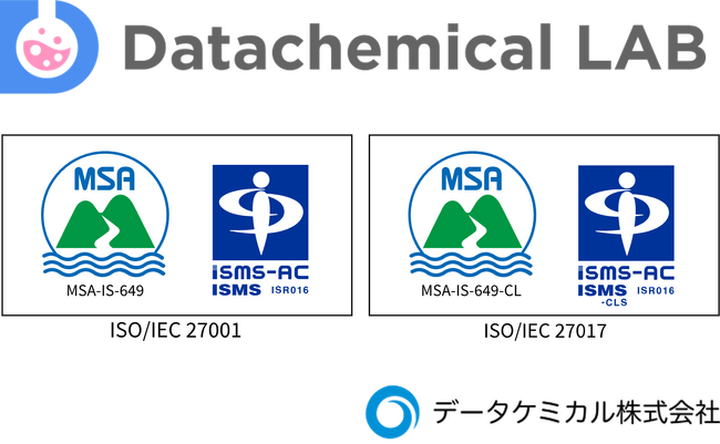 化学の実験データ活用AIクラウドサービス「Datachemical LAB(データケミカルラボ)」を提供するデータケミカル株式会社(代表取締役:吉丸昌吾、本社:東京都渋谷区)は、2023年5月、情報セキュリティマネジメントシステム(ISMS)の国際規格である「ISO/ IEC 27001」、およびISMSクラウドセキュリティ認証「ISO/ IEC 27017」を取得したことをお知らせいたします。