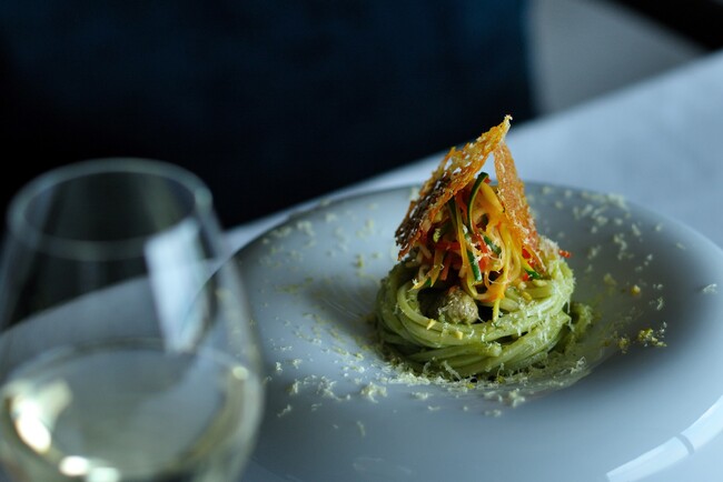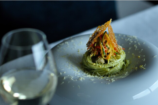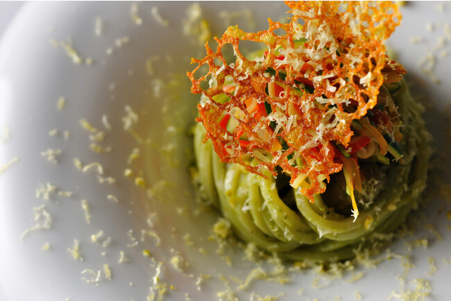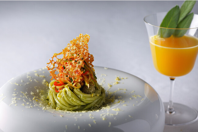 トマト・アーモンド・ニンニク・バジルを合わせたシチリアの伝統的なソース「トラパネーゼ」のパスタに、沖縄のブランド豚「紅豚」のサルシッシャを合わせました。紅豚は希少な沖縄の在来種「アグー」の良さを受け継いだジューシーな味わいが特徴です。ウコンとサフランをあわせた色合いも鮮やかなチュイルを飾り、熟成が進むごとに辛味をます黒胡椒の粒が入ったチーズを仕上げに削りかけます。パリパリとした食感にスパイシーな香りが食欲をそそります。