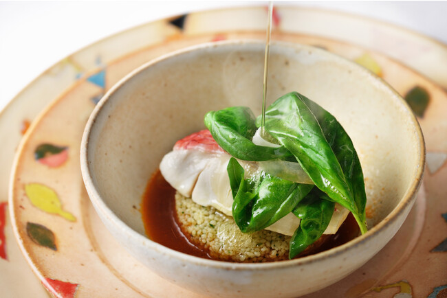 沖縄で三大高級魚とされる「アカマチ(ハマダイ)」は、アカマチとトマトの旨味たっぷりのスープを含ませた、クスクスと一緒に味わいます。上にどっさりとのせたバジルに、熱々の胡麻油を注ぎ入れれば、バジルのスパイシーな香りが立ち登り、食欲をそそります。