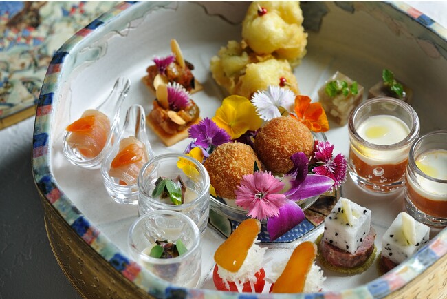 琉球王朝時代に宮廷料理で使われていた東道盆(とぅんだーぶん)から着想を得た、前菜の盛り合わせです。もともとは漆器で作られていた蓋付きの器で、来客をもてなす際に様々な料理を少しずつ盛り合わせて振る舞われていました。シチリアと読谷村の街並みが融合した風景を描いた鮮やかな焼き物の器の中に、一口サイズの料理を散りばめ、華やかにおもてなしを表現しています。