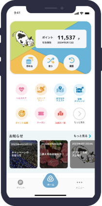 また、健康に関する機能などアプリを活用することでポイントの獲得が可能で、ポイントは合志市内の加盟店で利用できるほか、抽選への参加や寄付もできます。アプリを通じて健康と経済の両分野で市民の皆様と行政を結び、地域の活性化を目指しています。