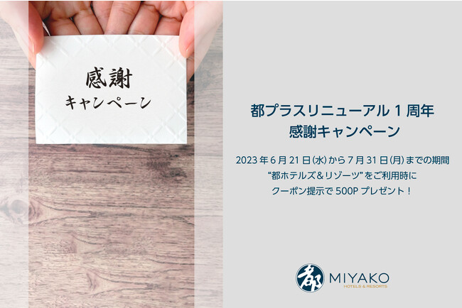 都ホテルズ&リゾーツは、会員プログラム「都プラス」がリニューアル1周年を迎えたことを記念し、ご愛顧いただいている会員の皆様に感謝の気持ちを込めて、2023年6月21日(水)から7月31日(月)までの期間、「都プラスリニューアル1周年 感謝キャンペーン」を開催します。キャンペーン期間中、都ホテルズ&リゾーツをご利用、ご精算後にアプリクーポンをご提示いただくと、その場で500ポイントをプレゼントします。なお、期間中に新規入会しご利用された方も対象です。