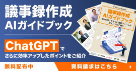 「議事録作成AIガイドブック」(PDF)をお求めの企業担当者様は、 以下お問い合わせフォームに必要事項記入の上、 お問い合わせ内容欄に「議事録作成AIガイドブック」希望と記載し送信ください。