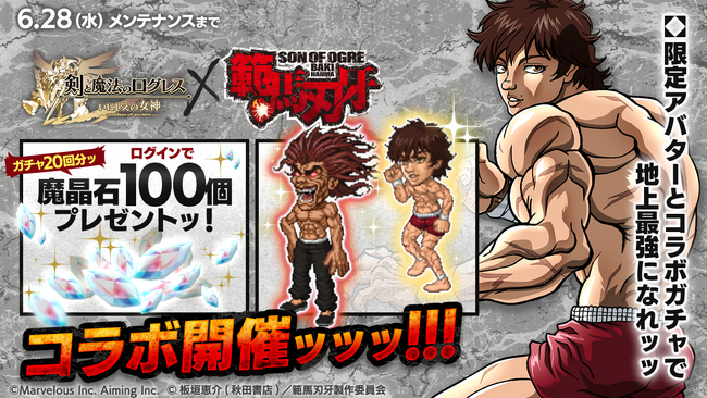株式会社マーベラス(代表取締役社長:佐藤 澄宣/所在地:東京都品川区)は、スマートフォン向け本格オンラインRPG『剣と魔法のログレス いにしえの女神』において、2023/6/14(水)に『ログレス』×『範馬刃牙』コラボの開催を含むアップデートを行ったことをお知らせいたします。