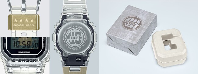 今回ご案内します40周年記念モデル『CLEAR REMIX』は、これまでにない新たなチャレンジとして、モジュールや回路基板などの内部の部品を見せるデザインにより“G-SHOCK”のチャレンジ精神を表した耐衝撃ウオッチです。初号機の角型フォルムをはじめ人気の7モデルを厳選しケースやバンド、液晶、ボタンなどにスケルトン素材を採用しました。