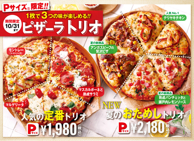 『夏のおためしトリオ』は、夏の新作「パンチェッタと瀬戸内レモンソース」と「アンガスビーフの贅沢ピザ」、さらに定番人気No.1の「テリヤキチキン」を1枚で楽しめPサイズ限定の新商品です。