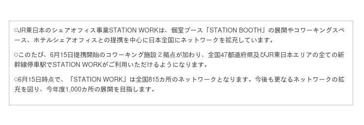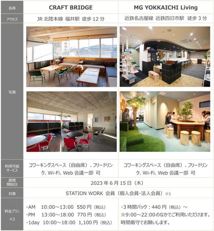 STATION WORKは今回新たに、福井県「CRAFT BRIDGE」、三重県「MG YOKKAICHI Living」と6月15日より提携を開始します。これにより、47都道府県及びJR東日本エリアの全ての新幹線停車駅でSTATION WORKがご利用いただけるようになります。