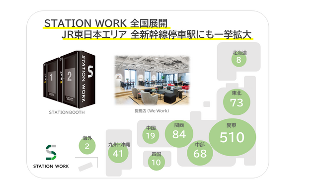 これまで首都圏、および郊外の主要駅に「STATION BOOTH」の展開を行っておりましたが、今回新たに「STATION BOOTH Light」、「STATION BOOTH Air」を設置することで、更なる利便性の向上を図ります。コワーキング施設との提携も含めて、JR東日本エリアの全ての新幹線停車駅でSTATION WORKがご利用いただけます。