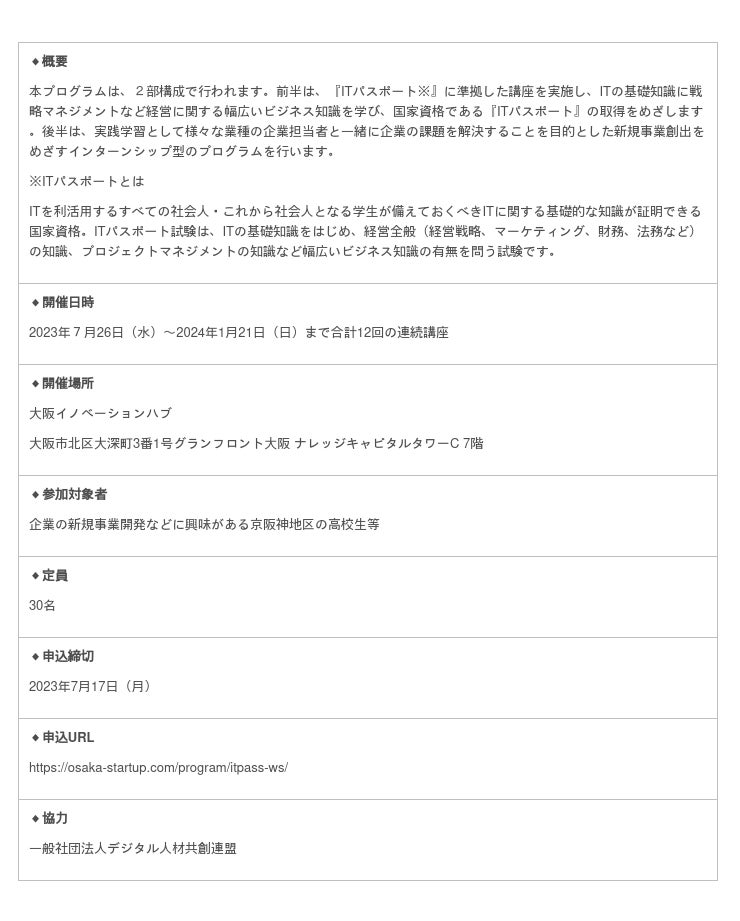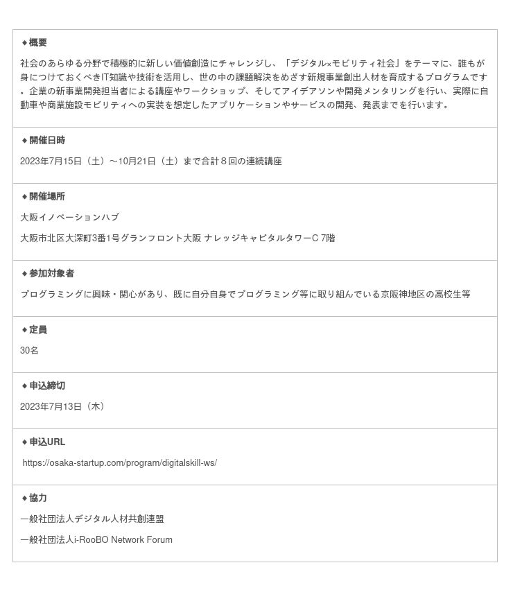 公益財団法人大阪産業局は、京阪神スタートアップアカデミア・コアリション(略称、KSAC/よみ:けーさっく)(※1)と連携し、高校生等を対象とした、デジタルスキルを身につけるチャレンジワークショップやインターンシップ型プログラムを開催します。