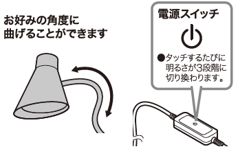 フレキシブルアームのため、お好みの角度に曲げることができます。勉強や読書はもちろん、ベッド・収納棚につければ、テーブルランプやスポットライトとしても利用できて便利です。