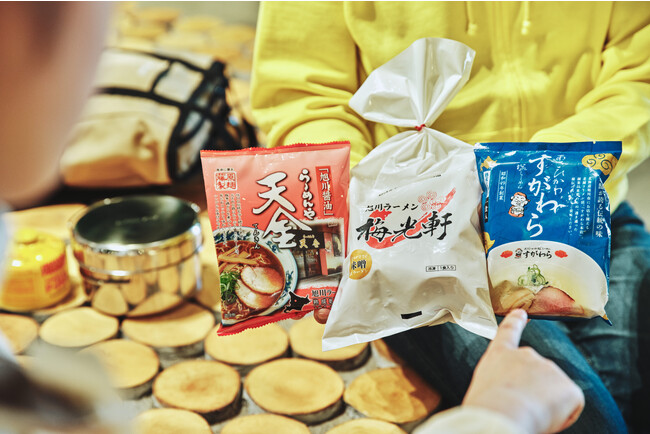山の上で食べるラーメンは、塩・醤油・味噌の3種類から好きなものを選べます!袋ラーメンに、それぞれのお店から特別に用意してもらったチャーシューなどの具材をトッピングすることで、お店の味を自身で再現することができます。塩は透き通るスープが特徴の「すがわら」、醤油は豚骨をベースにした深いコクのある「らーめんや天金」、味噌は濃厚ながら飽きのこないすっきりとした後味の「梅光軒」。味によって異なるお店で用意しています。さらにOMOレンジャーがそれぞれのお店