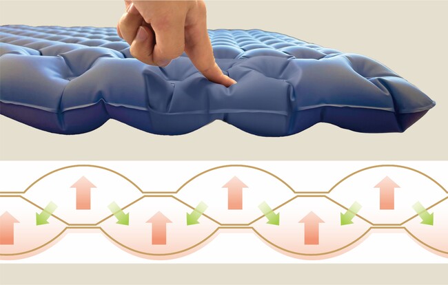 エアマットに乗る際にかかる上層の圧力を下層に2方向に分散する構造により、上層が圧縮されても下層が体重を支えることができ、底付きを防止します。(※底付きとは、骨や体が直接床などに圧迫される状態のことを指します。)