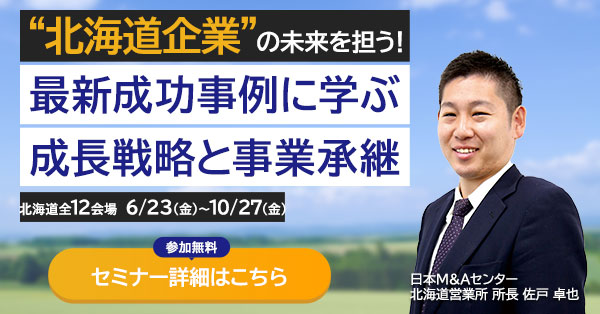 株式会社日本M&Aセンター(本社:東京都千代田区 / URL:https://www.nihon-ma.co.jp/)は、北海道の経営者の皆さまに向けたセミナー「"北海道企業向け"経営戦略としての資本活用セミナー」を開催します。2023年6月23日(金)から10月27日(金)までの期間に、道内12会場を巡回します。M&Aを活用して事業承継や成長戦略を実現した企業オーナー様をお招きし、日本M&Aセンター北海道営業所長の佐戸卓也が北海道のM&A動向を解説いたします。参加無料。