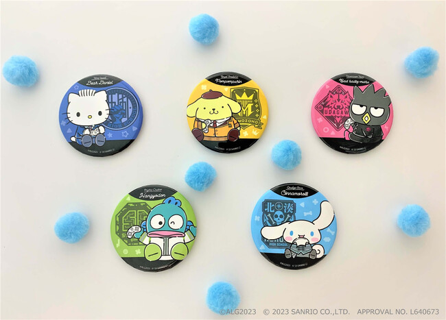 直径6.5cmの大きめ缶バッジには、学校それぞれの“イメージカラー&エンブレム(校章)”がデザインされています。各校の制服に身を包んだディアダニエルやポムポムプリンたちが、コントローラー片手にゲーム大会を繰り広げているかのよう!