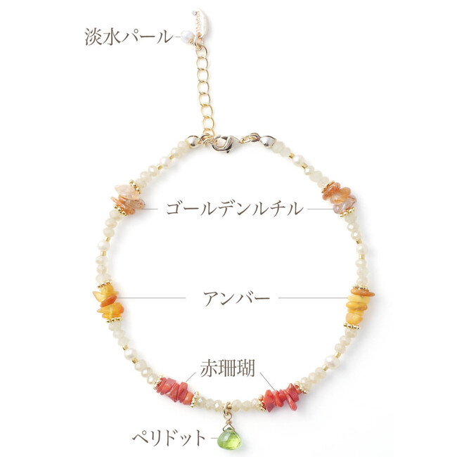 ラリマーや各色オパール、天然のコーラルやアンバーなど、ラフカットの希少な石と淡水パール、ペリドットやピンクトパーズの太陽の石をあしらい、上品に仕立てたアンクレットは、世代を問わず身に着けていただけるナチュラルな表情が魅力。