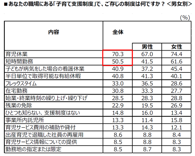 一方、「在宅勤務」や「フレックス勤務」など、子育てに関わらず、幅広い雇用者層で利用できる制度については、むしろ男性の利用率が高くなっています。これらの制度は、仕事と子育ての両立を図る上で柔軟な就労環境を整備するためにも重要な制度と言えます。多様な層が制度を活用しながら働き方を変えていくことで、子育てや介護などさまざまな事情を抱えながら働く人への理解も進むのではないでしょうか。
