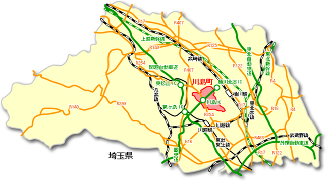 川島町は、埼玉県のほぼ中央に位置する田園風景の広がる自然豊かな町です。都心からのアクセスも良好で、関越練馬ICから圏央道川島ICまでわずか24分の距離にあり、都心からも気軽に訪れることができます。川島町では、日本一長いバラのトンネルや堤防を彩る菜の花、彼岸花など、四季折々の花々が咲き、美しい景観を見ることができます。水と緑あふれる土地からは、おいしいお米やいちご、いちじくなどが採れ、町の特産品となっています。