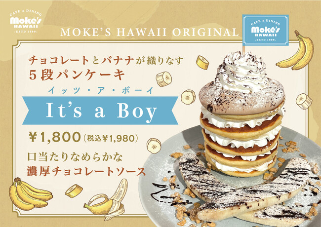 江の島の”映えデートスポット”!モケスハワイ江の島店より、5段パンケーキ新登場!濃厚チョコレートソースとバナナが織りなす5段パンケーキ「It's a boy」モケスハワイ江ノ島店にて発売開始