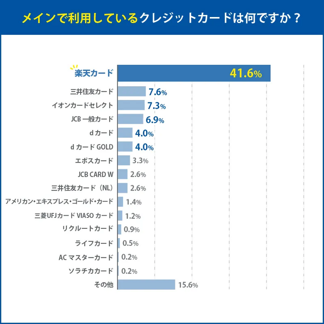 メインで利用しているクレジットカードについて、楽天カードが41.6%を占める結果となりました。