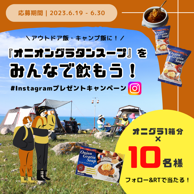 アウトドア飯・キャンプ飯に! お湯を注いで30秒の超時短・本格派だから、いつでもどこでも楽しめる。 『オニオングラタンスープ』をみんなで飲もう! 公式Instagramプレゼントキャンペーンスタート!