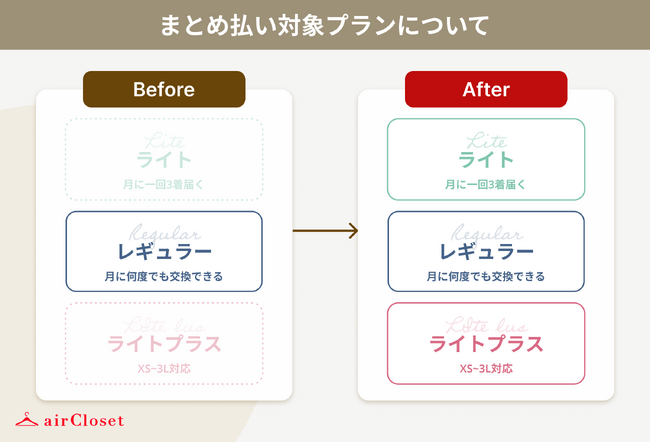 2016年に開始した「月額料金まとめ払い」は、これまでレギュラープランのみ対象となっていましたが、今春よりライトプラン・ライトプラスプランへの適用を開始しました。3ヶ月・6ヶ月・12ヶ月分一括払いの3パターンでの展開となり、12ヶ月プランでは1ヶ月の月額費用分の割引となります。また、すでに1ヶ月プランでお申し込み中の場合でも、途中で「月額料金まとめ払い」への変更が可能です。これにより、今まで以上に月額制ファッションレンタルサービスを手軽にお使いいただけるようになりました。