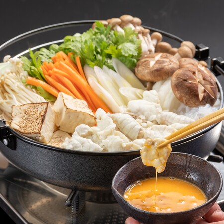 弾力のある新鮮な山口県産の延縄漁天然真ふぐを、すき焼きにアレンジしました。付属の和風出汁はとらふぐのアラを長時間かけて煮込んでいます。お好みの野菜と一緒に、溶き卵をつけてお召し上がりください。