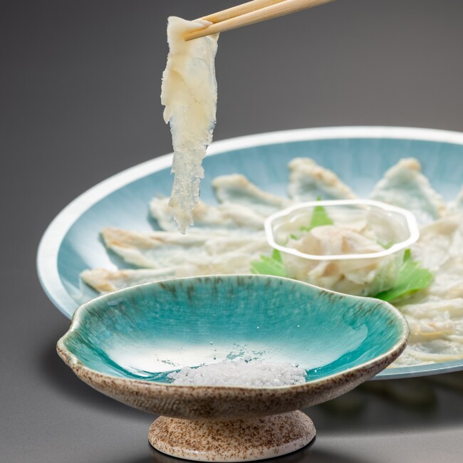 山口県産の延縄漁天然真ふぐを、清涼感のある霜降り造りにしました。春帆楼特製のだいだいぽん酢※2と、山口県長門の百姓庵100ZEN海の塩※3でお楽しみください。