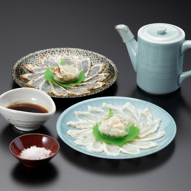 山口県産の延縄漁天然の真ふぐを、霜降り造りとタタキに調理した清涼感たっぷりの商品です。