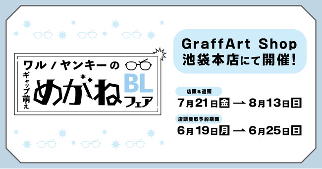 株式会社A3(本社:東京都豊島区、代表取締役:小澤隆史)は、出版社10社の垣根を超えた“初の試み”となる「ワル/ヤンキーのギャップ萌えめがねBLフェア」を2023年7月21日(金)よりグラフアートショップ池袋本店および通販サイト(eeo Store)にて開催いたします。