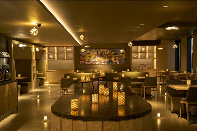 ナイトタイム限定でOMOカフェが水引で彩られた空間に変身します。装飾は、水引の伝統的な結び方「あわじ結び」と、加賀水引の特徴である立体的な作りを活かしたデザインです。例えば、天井には、松竹梅をモチーフに、水引の影が美しく映し出されるように結び方を工夫したくす玉を吊り下げ、テーブル上には、あわじ結びを連ねたデザインで、あかりのゆらめきも感じられる行灯を設置します。また、床にも行灯を配置して、足元や壁面の低い位置にも水引の影がくっきりと映るようにしました。水引を飾るだけでなくあかりで灯すことで、空間全体に水引の影が映し出されます。まるでOMOカフェが水引で包まれ結ばれているような、幻想的な空間になり、しっとり落ち着いたナイトタイムを演出します。