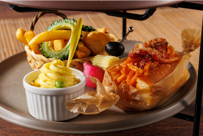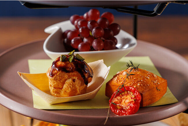 スイーツには、ホテルの所在地でもある吹田市内で栽培されたバナナを使い、金魚すくいをイメージした“チョコバナナクレープ”や、りんごの代わりに大阪産トマトで作った“トマト飴”。スーパーボールに見立てた、大阪産レモンを入れた寒天やフルーツと一緒に楽しむ“杏仁豆腐”などがお楽しみいただけます。その他、大阪産デラウェアやチーズを混ぜた風味の良いシュー皮に大阪産ポークのリエットを詰めた“たこ焼きに模したグジェール”などのフルーツやセイボリーも登場いたします。