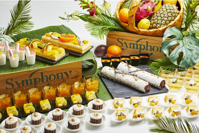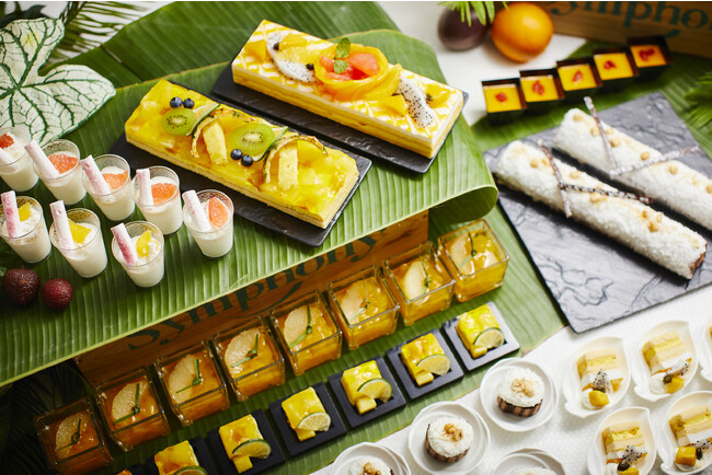 デザートコーナーでは、フルーツカービングや濃厚な味わいのマンゴープリン、パッションフルーツのクリームをふわふわのメレンゲ生地で包んだパブロバロール、優しい酸味のレモンゼリーと塩キャラメルのヴェリーヌなど、夏を代表する果実をふんだんに使用したスイーツが勢ぞろいいたします。