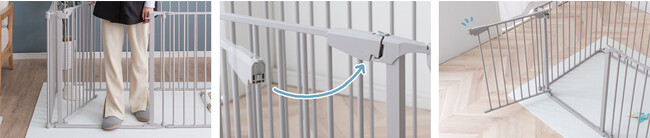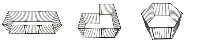 本製品はそれぞれのパネルを取り外してご使用いただくことができ、愛犬の成長やお部屋のサイズに合わせた自由なレイアウトが可能です。愛犬が小さい頃は4枚のパネルのみを使用して小さな正方形の形で使用し、成長して大きくなったらすべてのパネルを用いた大きなレイアウトに変えることもできます。