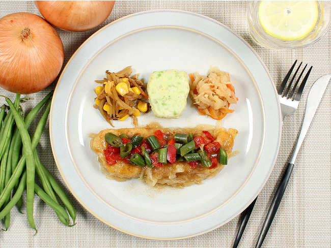 ふわっと揚げた白身魚に、甘辛い醤油だれとお出汁を合わせた山椒あんで仕上げました。細かく刻んだいんげんと赤ピーマンにさわやかな香りが特徴の山椒を贅沢に使用しておりますので、香りも合わせてお楽しみいただけます。