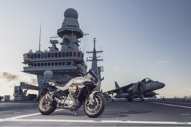 この感動的なエピソードに由来し、2022年9月にはモト・グッツィ V100マンデッロ・アヴィアツィオーネ・ナヴァーレの世界初公開が、空母カヴールの飛行甲板に設けられた豪華なステージで行われ、モト・グッツィとイタリア海軍との100年以上にわたる両者の固い絆を記念した式典を開催しました。