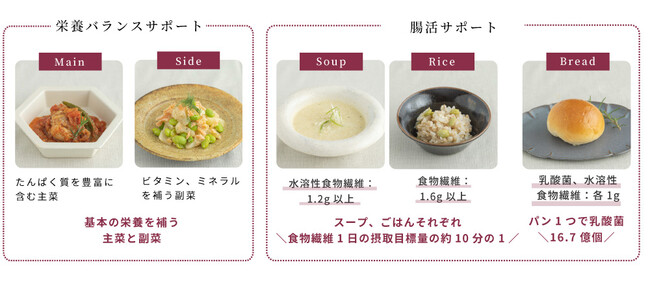 たんぱく質を豊富に含む主菜、ビタミンやミネラルを補う副菜、食物繊維が1日の摂取目安量の10分の1が摂れるごはんとスープ、食物繊維、乳酸菌を16.7億個含むパン、低糖質デザートのラインナップです。