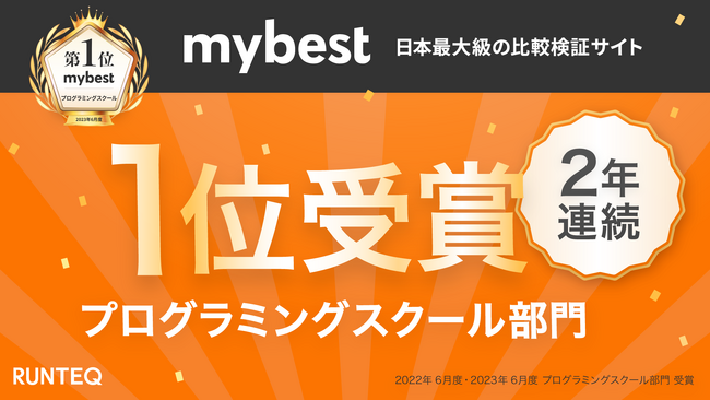 超実践型エンジニア育成スクールRUNTEQが、日本最大級の比較検証サイト「mybest」にて、2年連続でプログラミングスクール国内1位の評価を獲得しました。高品質なカリキュラムと総合的な学習サポートが受講生に支持されている点が評価されました。