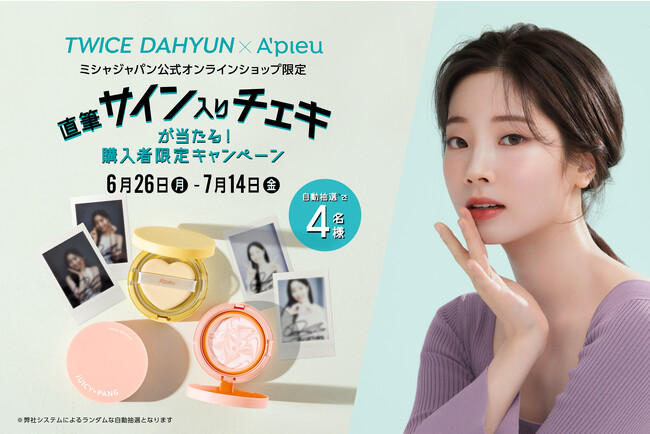 株式会社ミシャジャパン(本社東京都港区)が展開する、韓国コスメブランド“A’pieu (アピュー)”は、ブランドミューズTWICE ダヒョンの直筆サイン入りチェキが当たる購入者限定キャンペーンを2023年6月26日(月)から7月14日(金)まで実施します。