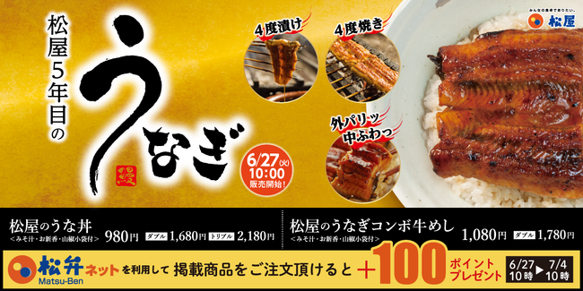 6月27日10時~7月4日10時まで、松弁ネットを利用して「松屋のうな丼」関連商品のお弁当をご注文頂けると、100ポイントプレゼントいたします。