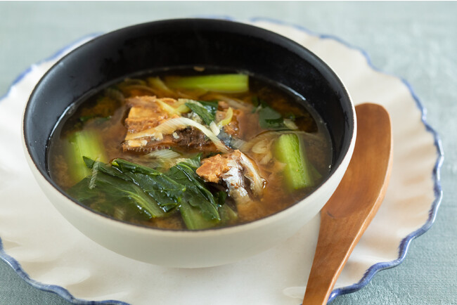 さばには鉄とたんぱく質、ビタミンB12が、小松菜には、鉄、ビタミンC、葉酸が多く含まれています。一杯に栄養がぎゅっと詰まっているうえ、忙しい朝に5分ほどで作れるお手軽なスープです。