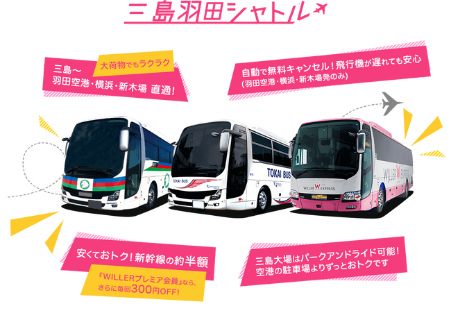 2. 運賃(大人片道)は三島~横浜駅間が2,400円、三島~羽田空港・新木場駅間が2,800円です。事前予約限定の「予約割引プラン」なら200円引き、「プレミア会員」ならさらに300円引きでお得にご利用いただけます。また、羽田空港・横浜駅・新木場駅発では航空機到着遅延等により予約した便に乗車できない場合でも、出発時刻を過ぎると自動で予約がキャンセルされ、手数料無料で全額払い戻しとなるサービスを導入します。