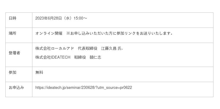 6/28(水)15:00~ 登壇|株式会社ローカルアド 代表取締役 江藤久昌 氏、株式会社IDEATECH 取締役 競仁志