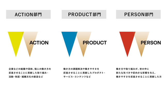 本年は、働きやすさの実現に向けた活動をより多様に捉えるべく、部門を「ACTION」「PRODUCT」「PERSON」の大きなカテゴリに再編成しました。ACTION・PRODUCTの2部門では、柔軟な勤務を認める新制度の導入、多様性に配慮した福利厚生の創設、「働く」をテーマにした映像作品・書籍など、「働きやすさ」を前に進める取り組みを幅広く募集します。6月22日より本アワード特設サイトからご応募が可能です。また、今回より、さらに多くの方に取り組みを知っていただくことを目的に一般投票を導入。審査員が選出した部門賞の中から、各部門のグランプリを1万人のビジネスパーソンによる投票で決定します。選出された取り組みは、働き方をアップデートした取り組みとして、11月下旬に予定されている表彰式とプレスリリースにて詳細を公表予定です。