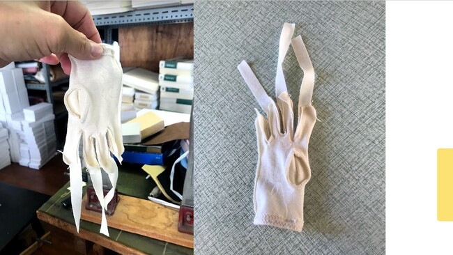 当社で企画・デザイン・生産している「UVカット手袋」の工場見学の写真を説明しながら、製品ができるまでを説明。